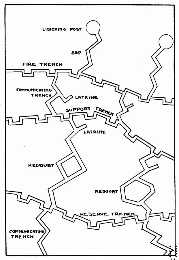 As the days go by, every effort must be made to improve the trenches. This can be done in many ways, some of which will be obvious. The front line is, of course, the most important one, and the greatest amount of work has to be done there. But support and reserve lines as well must be constructed and many communicating trenches. Support lines were usually dug at a distance of thirty to eighty yards from the firing line. In them we kept a few men to be used in case of emergency. This line was an exact duplicate of the front line and was intended to be used in case we were pushed back. The reserve line was about five to eight hundred yards back from the front line and was not brought to any very great degree of completion. Interspersed between these three lines were many redoubts, or especially strong points containing machine guns, etc., whose defenders were expected[76] to hold on to the very last and take advantage of their more secure position to make the attacker pay dearly for his advance. All these lines had to be linked up by communicating trenches, which started about a mile in the rear of the front line and went up in zigzag lines to the latter position, crossing the other trenches on their way. These communicating trenches are used for the purpose of bringing up troops and supplies, etc., and for taking to the rear the men that have been wounded. It is usually arranged to have some of these trenches "Up" and some of them "Down" roads. Each line of trenches (except of course the "communicating") contain dugouts for the use of the troops that hold them. The distance between the communicating trenches varies from twenty-five yards to three or four hundred according to the state of perfection of the trench system.