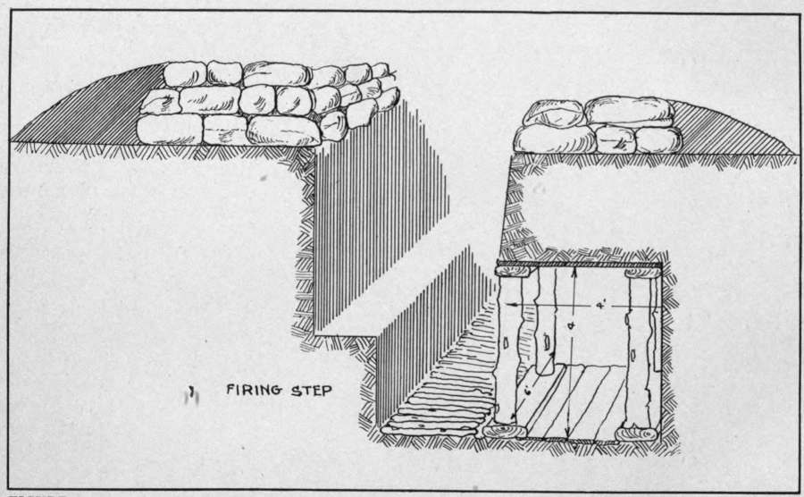 Trenches dug in the foregoing manner and protected by barbed wire will give the infantryman a chance to live. But he will increase or decrease the probability of coming out alive according as he is careful or careless during the time he is there. Nothing, of course, can save the men if the enemy is determined to thoroughly shell the line, and the orders are to hold it. The sanest thing when a bombardment begins is to withdraw to the next safe line. But the enemy will sometimes be content to allow[86] men to remain in their trenches for a while without shelling them provided they do not wilfully provoke him. A column of smoke arising from the trenches where the men were cooking was usually considered by the enemy as provocation, and over the shells would come. This brings us to the point that I wish to make regarding fires. The men must eat during their tour of duty, and they must have hot food, consequently fires of some kind are needed. But they should be made of very small pieces of wood cut up with a pocket knife so small that they will not give off any smoke. By following this method a safe and very hot fire can be made. At times we were supplied with small quantities of charcoal which was very acceptable. As a matter of fact, more liberties in this connection can usually be taken in the firing trench than in the support or reserve trenches. The enemy knows perfectly well men are in the firing trench. He sees from the rifle fire that that is manned, but it is a good thing to keep him guessing about the other trenches.