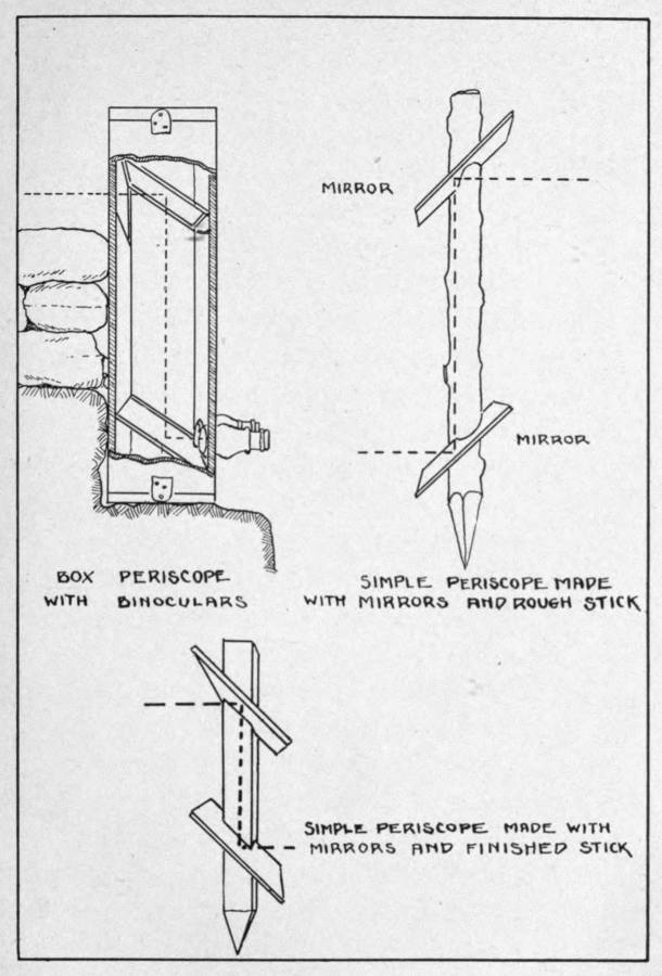 To make the image in the periscope clearer, binoculars can be applied to the lower glass at the proper angle, and almost as clear a view obtained as by looking over the parapet. One disadvantage of the periscope is that it makes the distance seem greater than it really is, and many a man receives a shock when he places his head above the parapet after looking through a periscope for a while, to see how close the enemy trenches are.