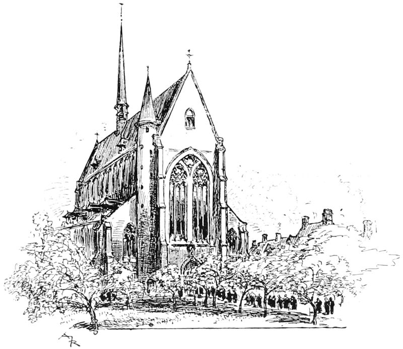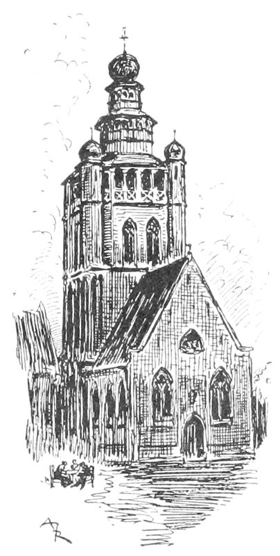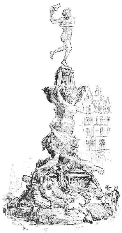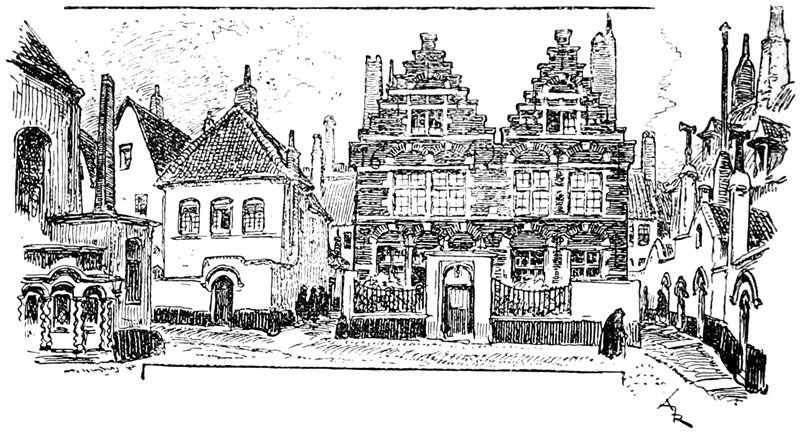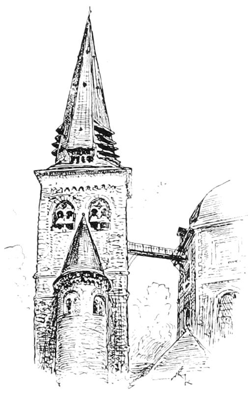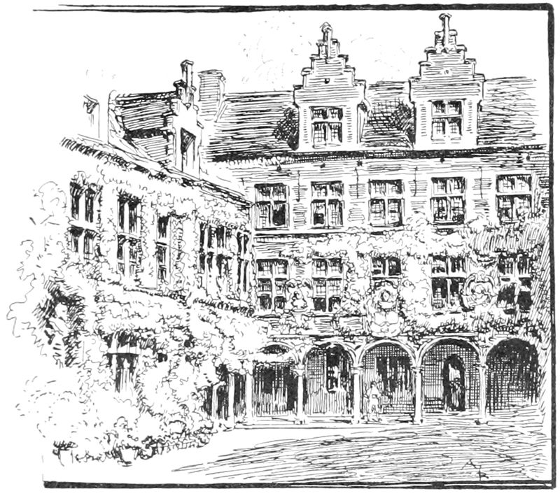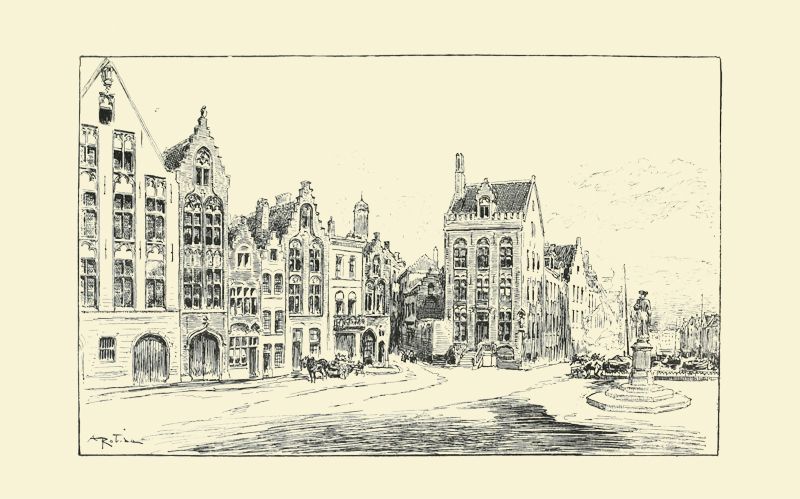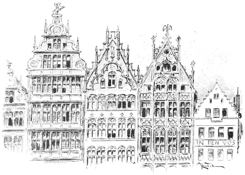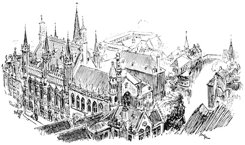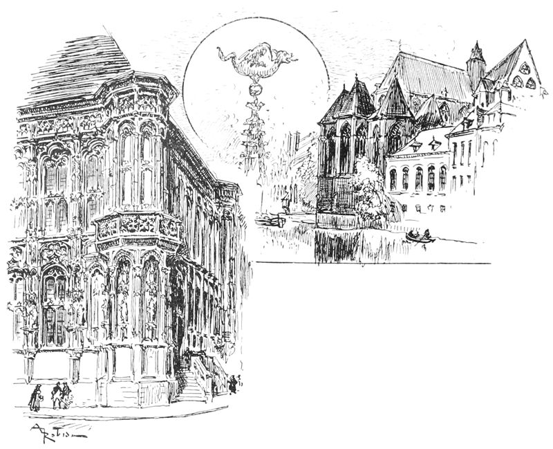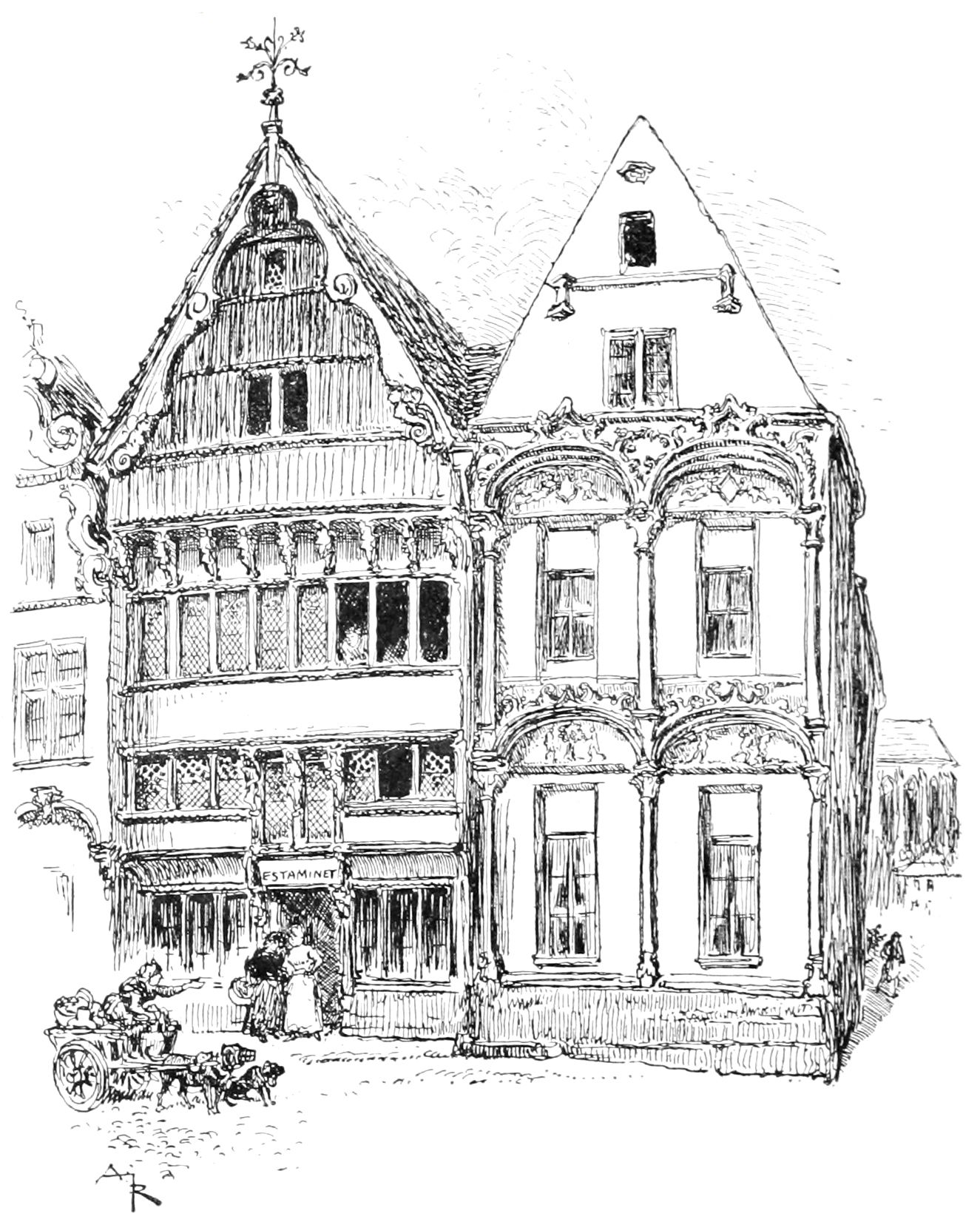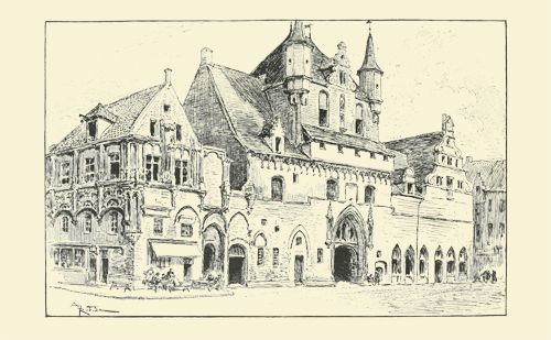 La grande place, immense avec un important Hôtel de ville, manque aussi de couleur. Que n'a-t-elle gardé un peu plus de ses vieilles maisons d'autrefois! Il y en a encore deux dans un coin, perdues et comme honteuses, les pauvres belles de jadis, au milieu des façades rectilignes et ennuyeuses. Cependant elles ne manquent pas de charmes, avec leurs étages en encorbellement, leurs pignons ardoisés, leurs consoles sculptées, tandis que l'impitoyable—et pitoyable—goût moderne a rasé soigneusement les façades voisines, et distribué partout les fenêtres à intervalles réguliers.