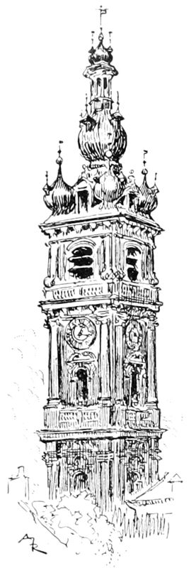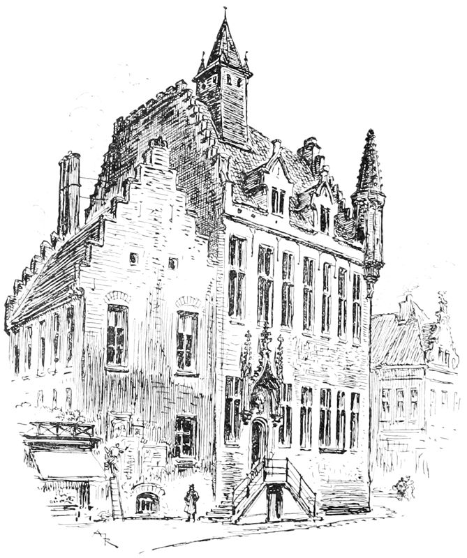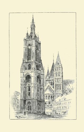 Le beffroi est superbe. C'est une grosse tour du quatorzième siècle, à hautes et larges fenêtres, flanquée de quatre tourelles coiffées de clochetons qui se hérissent de petites lucarnes. Au-dessus des créneaux se dresse un campanile de bois octogonal à quatre ou cinq étages de lucarnes sur lucarnes, se chevauchant l'une l'autre, laissant voir cloches et clochettes et non moins hérissés de pointes et de crochets, d'épis, de girouettes, d'aiguilles et de hallebardes, avec le lion de Flandre brandissant la dernière girouette au sommet. Une partie de la façade est moderne et par derrière une autre façade et des ailes en retour ont été construites dans le style du monument primitif sur une large cour.