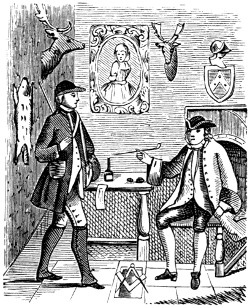 28. The Logger Heads. Ditto. By Ditto. [Underwritten, the old Joke of We are Three. Shakespeare plainly alludes to this sign in his Twelfth Night, where the Fool comes between Sir Toby Belch and Sir Andrew Aguecheek, and, taking each by the Hand, says, “How now, my Hearts, did you never see the Picture of We Three?”]
