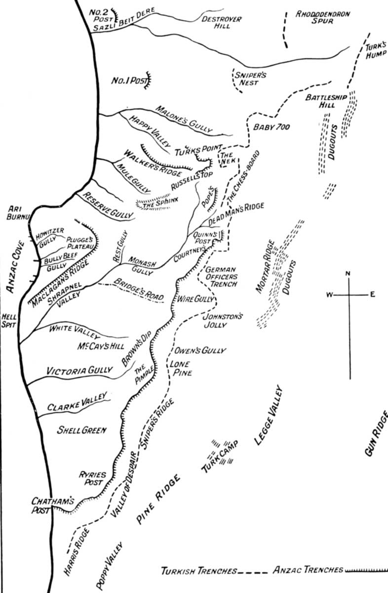 My rough maps and sketches have been transformed into works of art by A. E. West, Esq., and W. Bedkober, Esq. All distances in the Anzac area should be measured on the large folded map at the end of the volume.