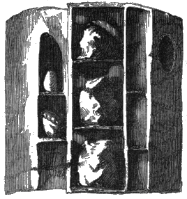 In these simple experiments, which were repeated sufficiently often to render the results certain, we have a most interesting proof that insects breathe. The first struggles and apparent intoxication can be compared to nothing more exactly than to the same phenomena when they take place in human beings breathing the vapours of ether, or chloroform. The subsequent state of insensibility was precisely similar to that induced in persons who are put under the influence of these vapours. An amusing instance of the restorative powers of fresh air occurred in the course of these experiments. A blue-bottle, which was purposely selected of as large a species as could be found, was [401] first intoxicated and rendered insensible by coal gas, and was then as quickly as possible put into a net of the geometric spider: instantly the spider flew upon his bulky captive, but the fresh air began to take effect on the fly, and it commenced struggling in the most furious manner. Although the spider cast out a cloud of web, and in the most energetic manner endeavoured to envelope its prey, the fly seemed likely to be the victor; one of its large and powerful wings got free and flapped violently until the meshes of the web gave way, or was, perhaps, broken by the weight of the insect, and fly and spider, being suspended in the air, spun round so swiftly as to be quite indistinguishable. Ultimately, the spider conquered; and, suspending the huge body of its victim by a rope in the air, returned for a short time to its den.