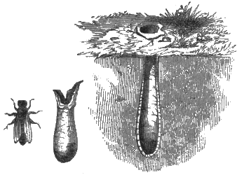 The death-tick beetle has also a terrible reputation for frightening people. This little creature takes up its abode in decayed wood, and thus frequently makes the bed-post its dwelling-place, or ensconces itself in the wainscot of an old room. Now, when, as some entomologists tell us, it wants to give a signal to its mate, the insect begins hammering with all its might at the side of the wall, or knocks upon its little floor until the noise is heard, and the mate then begins to hammer, both producing for their size a tremendous noise, but in human ears not sounding louder than the tick [7] of a large watch. The poor invalid, as he lies in bed perhaps very nervous and unable to bear loud conversation, hears the noisy insects knocking one to the other, and immediately his mind is filled with fears of the most groundless kind, which the nurse, if she is one of the old school, is sure to confirm by telling him that this ticking is the death-watch.