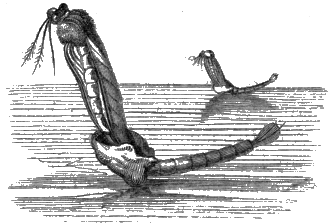 As the reader has laid his finger on his pulse, or felt his heart beating within him, or seen a drop of blood ooze from his wounded hand, have the questions never occurred to him,—Have insects blood-vessels, and a beating heart? And if so, have they blood like ours? Many a wise man of [406] old, even the great Baron Cuvier himself, has supposed that there was no circulation of the blood in insects. But, with a magnifying glass and a caterpillar before us, we shall soon be satisfied that this is a great mistake, for by carefully looking along the insect's back we shall perceive in that part a very evident pulsation, as though a fluid were pushed at regular intervals towards the head. The cut represents the circulation in the vessels of the larva of an Ephemera. But insects have no heart, like that of man and animals. What, then, can this beating organ be which we behold? Although it is not like our heart, it is nevertheless an organ which serves all the purpose of ours, and pumps on the blood with great regularity. Instead of being a muscular organ of small size, but great thickness, like our heart, it is in reality a long tube, called the dorsal-vessel, running along the abdomen and thorax of the insect, into which the blood is poured by the veins, and out of which it is forced on towards the [407] head by the regular contractions of its side. This causes the beating movement which we saw in the caterpillar. Perhaps there may be some curiosity to know whether an insect's pulse beats faster or slower than ours. John Hunter counted thirty-four beats in a minute in a silk-worm. Another observer counted thirty a minute in a caterpillar of the pine-moth. But in the imago state the pulse appears to move much quicker: and it is easy to make an insect's beat extremely fast, by exciting or provoking it. Mr. Newport having done so to a bee, counted as many as 142 beats a minute. In a middle-aged man the pulse beats about seventy times in a minute; in a child seven years old about eighty-five times; and at the age of fourteen about eighty times. Hence it follows that our pulse beats about twice as fast as that of an insect in the larva state: in the imago state it is probably, as a general rule, at least in winged, active insects, higher than ours.