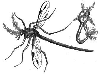 are in the larva state furious destroyers of other insects, and will gobble up aphides by the score in a very short time. The dragon-fly too stands conspicuous among the insect devourers, not only in its larva but in its perfect condition, and falls upon multitudes of insects, plucking off their wings, and with savage relish devouring their bodies. We are not, however, to suppose that the appetites of carnivorous insects are confined to insect-food. The blow fly lives upon and defiles by depositing its eggs in our butcher's meat. The cockroach will polish a bone as clean as, or cleaner than, any dog will, and, indeed, will consume almost anything that happens to come in its way. Lastly, we may not omit to mention, that some insects have to plunge their armed mouths into our flesh and that of other animals, and to slake their raging thirst in a draught of our life-blood: among which we will only enumerate the musquito, the gnat, and the flea. We need scarcely say, that insects are provided with proper organs of digestion.