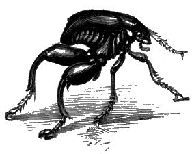 The purposes for which the legs are put into requisition are, as will be easily guessed, for walking or running, for jumping, for climbing, and for swimming. Most surprising in all these respects is the degree of agility and swiftness with which it has pleased the Divine Creator to endow these insect-organs. M. Delisle once observed a fly, [390] only as large as a grain of sand, which ran three inches in half a second, and in that space made the enormous number of five hundred and forty steps. If a man were to be able to walk as fast in proportion to his size, supposing his step to measure two feet, he would, in the course of a minute, have run upwards of twenty miles, a task far surpassing our express railroad engines, or the famous Seven League Boots recorded in the nursery fable. In leaping, also, insects far excel man, or any other animal whatever. The flea can leap two hundred times its own length; so also can the locust. If a man were six feet long, and could leap as high and as far as one of these insects, he might stand near Bow Church in Cheapside, leap up into the air over the top of St. Paul's cross and alight at the bottom of Ludgate Hill; which would be something more wonderful than it has ever entered into the minds of the writers of fairy tales to conceive of. The insect called the frog-hopper can leap more than two hundred and fifty times its own length. Some spiders can leap a couple of feet upon their prey. The legs of insects that swim are generally peculiarly fitted for it, either by their being expanded somewhat [391] like an oar, or by having a dense fringe of hairs upon them. The water-beetles, after rising to the surface of the stream for a supply of fresh air, dive down to their watery home again, taking a clear silvery bubble along with them; and, in this action, they move with considerable rapidity their swimming legs, which are clothed with hairs. The water boatman swims upon his back by means of his singularly formed legs. The little whirl-gig, of which we have before spoken, swims by means of its legs, which are paddle-shaped. By means, it may be, of some peculiar secretion, which repels the water, some insects can actually walk upon its surface, and that as readily or more so than upon land. Those who know the pleasures of shooting with polished skates over clear ice, when it almost seems as if we were moving in the air, and no more condemned to earth, can imagine something of the delight these insects must experience, who can glide as swift as thought over the glassy surface of the brook. Sometimes the shape of the hind-legs is remarkably altered, and, perhaps, [392] the most extraordinary instance of this in the whole insect world is, the foreign insect, which has been called the Kangaroo beetle. The cut represents faithfully this most wonderful creature; and we could almost fancy, as we looked at it, that by some accident the front pair of legs and the head had been twisted round, leaving the hind legs and part of the body turned in the opposite direction. It need scarcely be added, that the origin of this insect's curious title was derived from the resemblance borne by its hind legs to those of the animal whose name it bears. In some insects the legs fold upon each other, and are packed into a very small compass: this is particularly the case in a species of wood-louse, which roll themselves up into balls precisely resembling beads or pills, as may be imagined from the following anecdote. A servant maid of the great Swammerdam, while walking in the garden one [393] day, found a large number of round, black, shining beads, which were streaked with white bands, and presented a very pretty and attractive appearance. Gathering a number of these in her hand, she thought she would convert them into a necklace, or, for ought we know, into a rosary, when, to her great surprise, the beads became animated as soon as ever they felt the point of the needle, with which she was about to thread them, and began to struggle actively to get away; not, however, too quickly for her; for with a violent scream, imagining the beads were bewitched, she ran into the house. Some of the beetle tribe thus fold up their legs, and roll themselves up so as to resemble little globular pebbles.