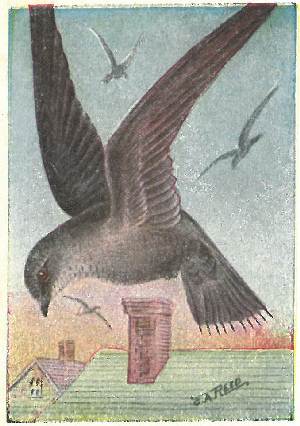 A house for Purple Martins may contain many apartments; it should be erected in an open space, on a ten or twelve foot pole. Boxes for other birds should have but one compartment, and should be about six by six by eight inches, with a hole at least one and one-half inches in diameter in one side; these can be fastened in trees or on the sides or cornices of barns or sheds. It is needless to say that English Sparrows should not be allowed to use these boxes. By tying suet to limbs of trees in winter, and providing a small board upon which grain, crumbs, etc., may be sprinkled, large numbers of winter birds may be fed; of these, probably only the Chickadees will remain to nest, if they can find a suitable place.