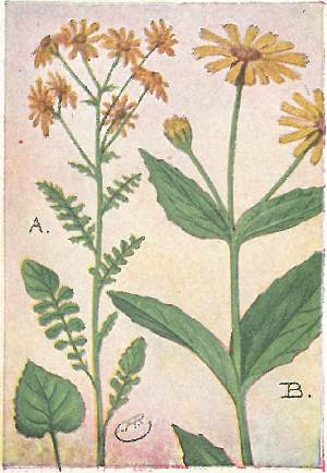 (B) Arnica (Arnica mollis). The slightly hairy stem grows from 1 to 2 feet tall. The basal leaves are long petioled but the stem ones are sessile and opposite, shallow-toothed. At the summit are one to nine flower-heads on slender peduncles. About the central disc are 10 to 14 yellow rays, each with three notches in their ends. Canada and the mountains of northern U. S.