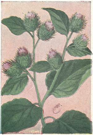 Burdock (Arctium minus) (European) is a very common plant on waste ground, along roadsides and the edges of woods. The plant is often 4 feet or more high. The lower leaves are very large, often more than a foot in length, heart-shaped, deep green and finely veined above, grayish beneath because of the fine wool that covers the under surfaces. The upper leaves are smaller, more ovate in form, and less densely wooly on the undersides. The flower-heads grow in clusters at the ends of the branches. The involucre is almost spherical, composed of numerous bracts, each terminating in a sharp, hooked point. Tubular florets, only, are seated within this involucre; they are purple and white in color, and secrete an abundance of nectar on which account they are frequented by honey bees.
