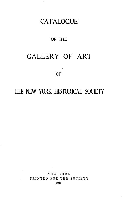 This catalogue describes the paintings in the Gallery of Art of The New York Historical Society, with two hundred and eighty-six miniatures, comprising the Marié Collection and seventy-six objects of Sculpture.