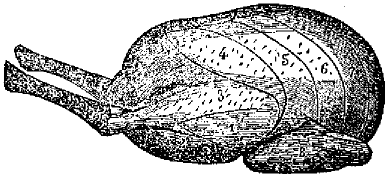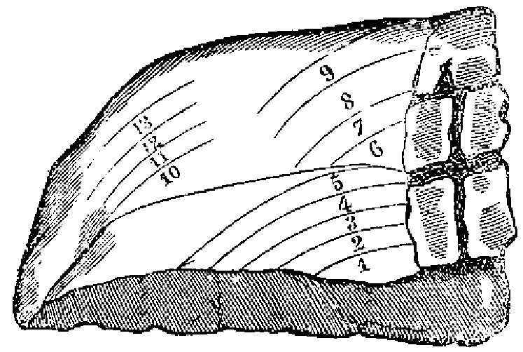 Las tajadas que están más adheridas á los huesos y las del omoplato, números 8, 9, 10, 11, 12, 13 y 14, son más tiernas, y con ellas se hacen generalmente los presentes á las señoras; pero muchos gastrónomos prefieren, sin embargo, la parte exterior núm. 7, que es más grasa y tiene tambien más sabor.