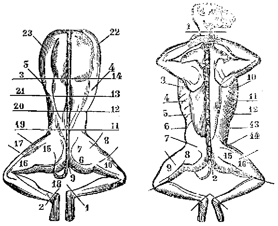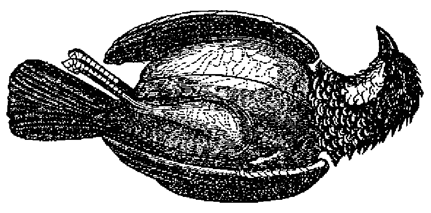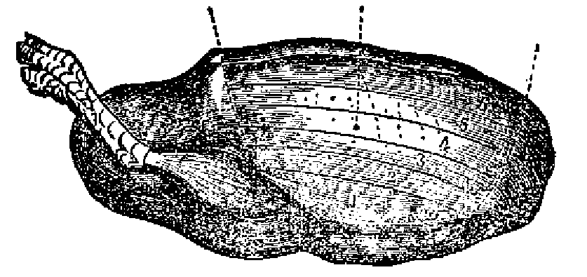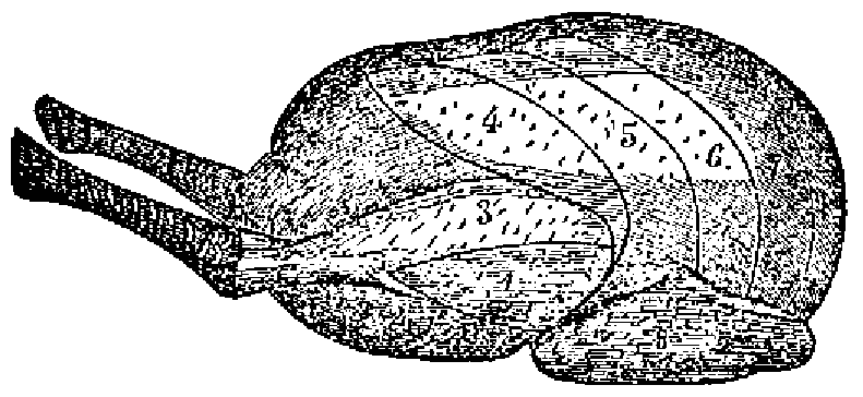 2.º Empezando por sacar las alas, despues de lo cual se rompe el cuerpo por encima de la rabadilla; la parte que queda con los muslos figura una especie de capuchon ó de mitra.