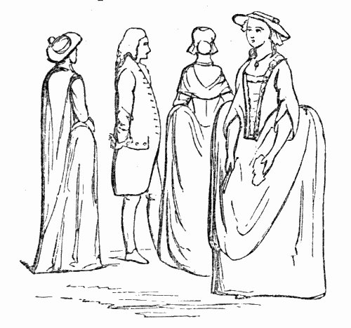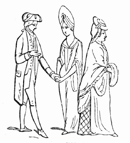 On the tomb of Sir Ralph de Rochford, in Walpole Church, Norfolk, his lady is by his side, dressed in a reticulated head-dress and veil, a standing cape to her robe, long sleeves buttoned to her wrists, a quatrefoil fastens her girdle, and a double necklace of beads hangs from her neck. At her feet is a dog looking up, and another couchant. In the chancel at Shernborne, Norfolk, the figure of Sir Thomas Shernborne's lady (1458) has at the right foot a small dog sitting, with a collar of bells.
