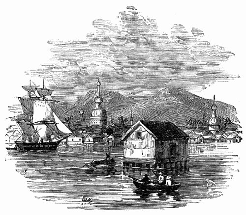 "These boats can scarcely sail, of course, except before the wind. But in ascending the Irawadi, as on the Ganges during the rainy season, the wind is almost always favourable. A fleet of them speeding before the wind with the sunlight on their bellying sails has a splendid though [Pg 669] fantastic appearance. With their vast spreading wings and almost invisible hulls, they look like a flight of colossal butterflies skimming the water."