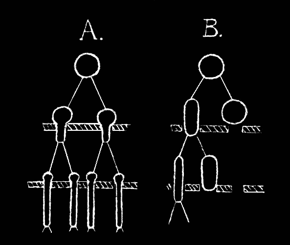 Diagram to illustrate: A, the transmission of acquired characters, B, modification of type by natural selection. In A an individual of rounded proportions, at the top of the diagram, has two children. Environment is represented by a board with holes through which they must pass. In so doing they become thinner, transmit the thinness to their children, and so on. In B, a man of rounded proportions has two sons who vary, one being fat, the other thin. The fat one cannot get through the hole in the board; but the thin one does, has children who again vary, the thin one having an advantage.