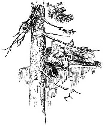 Startled from their work of digging in the sand, the two puppies looked up in wonder. They saw their enterprising brother rolling over and over down the bank. They saw their mother leaping toward them with a fierce cry. They sprang apart, with that sound impulse to scatter which Nature gives to her weak children. Then upon one of them a big muffled paw, armed with claws like steel, came down irresistibly, crushing out the small, eager [38] life. He was snatched up by a pair of strong jaws; and the lynx went bounding away lightly over the bushes with his prize. Finding himself savagely pursued by the mother fox, he ran up the nearest tree, a spreading hemlock, and crouched in the crotch of a limb with his victim under one paw. As the mother circled round and round below, springing up against the trunk in voiceless rage, the lynx glared down on her with vindictive hissings and snarlings. He was really more than a match for her, both in weight and weapons; but he had no desire for a battle with her mother-fury. For perhaps ten minutes she raged against the base of the impregnable trunk. Then realizing her impotence, she turned resolutely away and went back to her three remaining little ones.