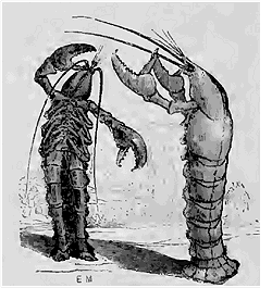 Une marche lugubre se fait entendre: un homard cuit, entouré de persil, est apporté; il est suivi d'un homard cru qui l'aima, et qui le suit en gémissant et en déplorant sa solitude. Nouvel Orphée, il parvient à retirer son Eurydice du royaume de Pluton, et, plus heureux que le virtuose antique, il peut danser un pas avec sa moitié sans craindre de la voir retourne nager dans les eaux du Styx. L'ensemble de l'exécution, l'harmonie, la souplesse des mouvements, la grâce des pose dont nous ne donnons qu'une bien faible idée dans notre dessin, arrachèrent une exclamation d'enthousiasme au flegmatique Schahabaham lui-même. Il ne fallait rien moins que les rébus d'Odry, expliqués par lui-même, pour tenir la curiosité en haleine après l'admirable danse des homards; mais aussi après les rébus toute émotion paraissait impossible, la surprise était épuisée lorsque le ministre de la marine annonça au gracieux sultan que l'on allai danser la vraie polka! Malheureusement, ajouta-t-il, le danseurs étaient quatre, mais l'un d'eux étant subitement tombé malade, trois seulement pourront danser la polka. Schahabaham, rouge d'indignation qu'on osât lui proposer une polka à trois, ordonne à son ministre de la marine de faire le quatrième danseur.