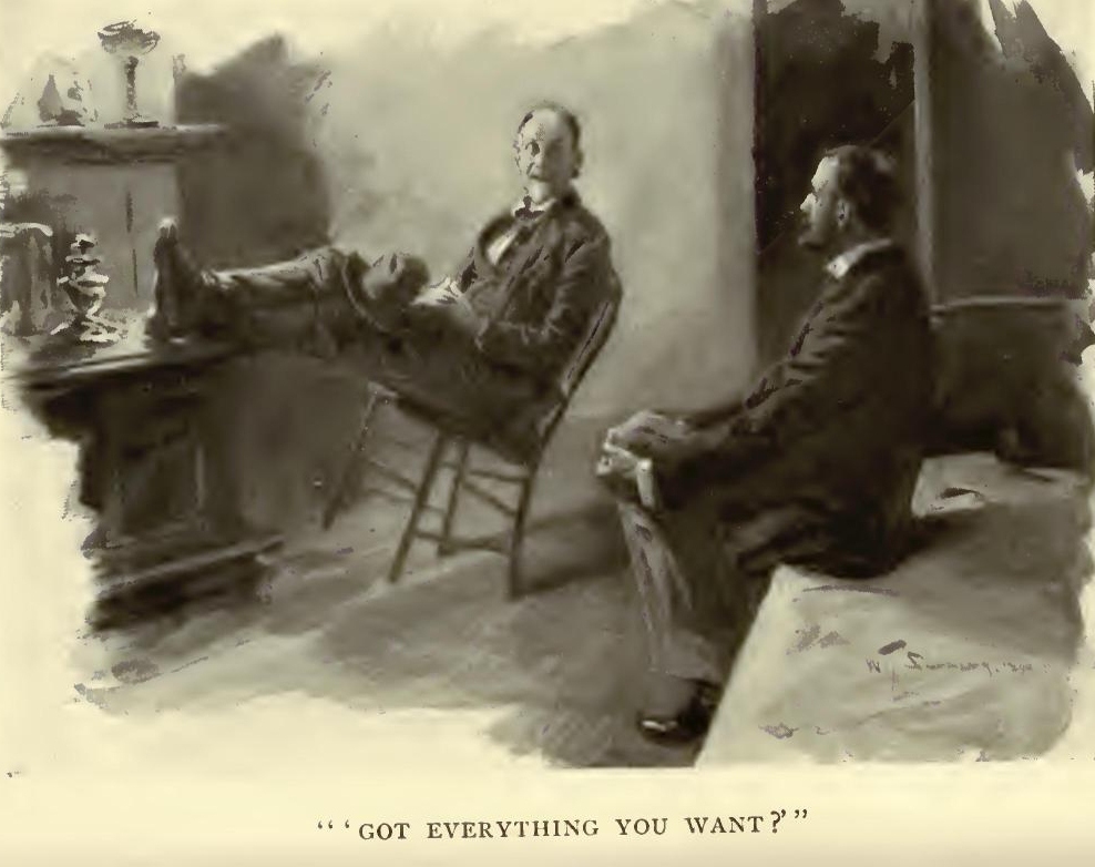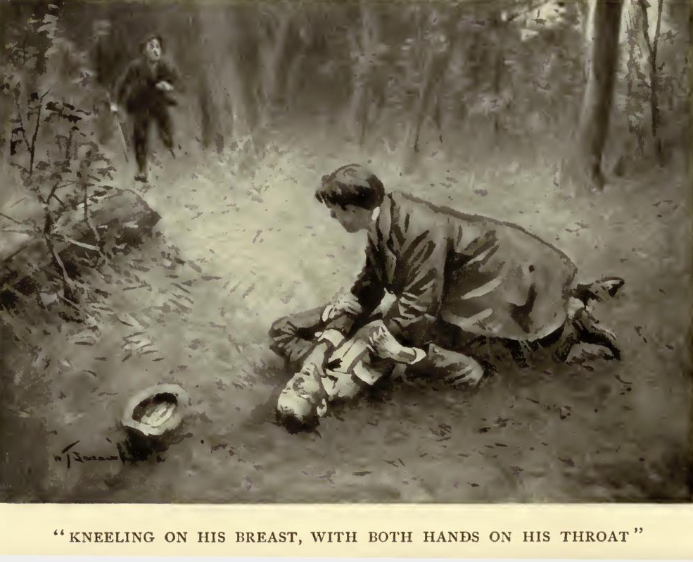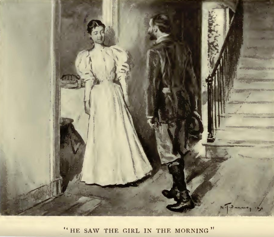 “Now, young man,” said the stranger, “will you go and do as you're bid? I'm ready to pay for my dinner, and you can say so.” The boy stared at him, slowly taking in the facts of his costume, with eyes that climbed from the heavy shoes up the legs of his thick-ribbed stockings and his knickerbockers, past the pleats and belt of his Norfolk jacket, to the red neckcloth tied under the loose collar of his flannel outing-shirt, and so by his face, with its soft, young beard and its quiet eyes, to the top of his braidless, bandless slouch hat of soft felt. It was one of the earliest costumes of the kind that had shown itself in the hill country, and it was altogether new to the boy. “Come,” said the wearer of it, “don't stand on the order of your going, but go at once,” and he sat down on the steps with his back to the boy, who heard these strange terms of command with a face of vague envy.