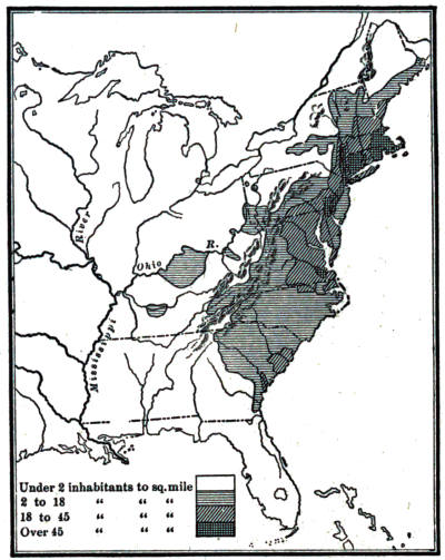 The progress of the Westward Movement in colonial times was slow. A hundred and fifty years passed before the frontier line was pushed beyond the Appalachian ridge. This slowness was due in part to the action of the English government. Soon after England (in 1763) came into possession of the country west of the Alleghanies the king issued a proclamation reserving most of the newly[6] acquired territory for the use of the Indians and forbidding the governors of the colonies to grant lands to white men west of the mountains. If this plan had been carried out, English civilization would have been confined to the seaboard, and the richest and fairest portions of the earth would have been permanently reserved as a hunting-ground for savages and as a lair for wild beasts. But the War of the Revolution took the Western country from England and gave it to the United States. The Ohio valley was then thrown open to settlers, and white men from all parts of the world rushed into the new lands like hungry cattle rushing into new pastures. In twenty years after the acknowledgment of our independence (in 1783) the Frontier Line moved farther westward than it had moved in a century under British rule.