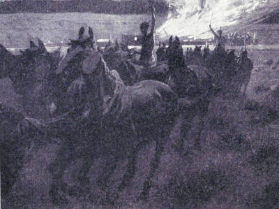 There are many camas prairies, big and little, in Montana and Idaho, and they all resemble each other in being fertile green basins among the mountains, in whose moist soil the camas plant flourishes. This was, perhaps, fifteen miles broad by twenty-five long—all magnificent grazing[211] land. We passed an Indian village of a dozen lodges, the doors of the tents shaded by arbors of green boughs, under which sat the squaws in their red, green and white blankets. On the plain fed herds of horses, and among them Indian riders galloped about seeking the animals they wanted to lariat for the next day's hunting expedition.