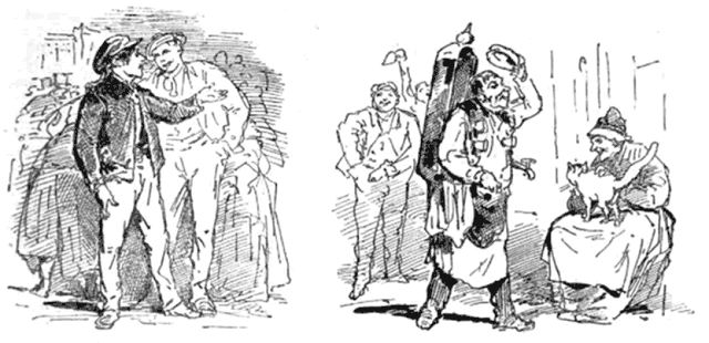 A la fête, le Bouquet. --Eh bien! Auguste, si tu veux savoir mon idée, la voilà; je suis bien content qui soit pas mort! --Qui ça? --Le fils du citoyen Darti. --Comment? --Oui, puisqu'on disait feu d'arti fils. --Canaille!  |