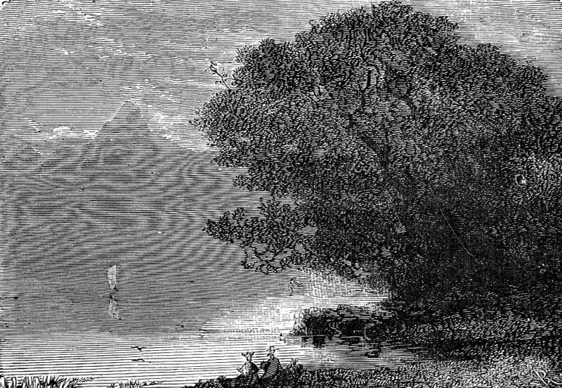 After dinner the traveling party had, as if in anticipation, seated themselves at the foot of a magnificent banksia; the young moon was rising high into the heavens, lengthening the twilight, and prolonging it into the evening hour.—p. 325.