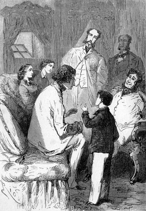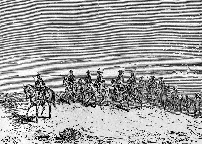 Ayrton and Olbinett took their places respectively in front and in the rear part of the cart, while Glenarvan, the major, Paganel, Robert, Captain Mangles, and the two sailors, mounted their horses.—p. 312.