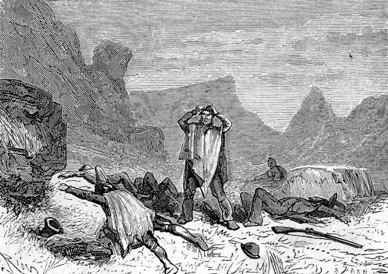 In the midst of these terrific gusts, Glenarvan, the major, and the captain bore the body of Mulready. The animal reared. Mulready seized his revolver and fired.—p. 420.