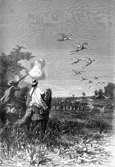 The major was skillful enough to shoot a very rare bird,—a "jabiru," or giant crane. This creature was five feet high; and its broad, black, sharp conical beak measured eighteen inches in length.—p. 317.