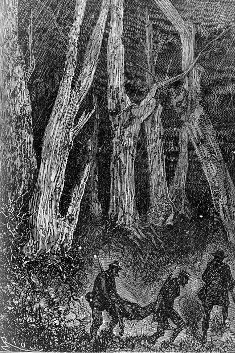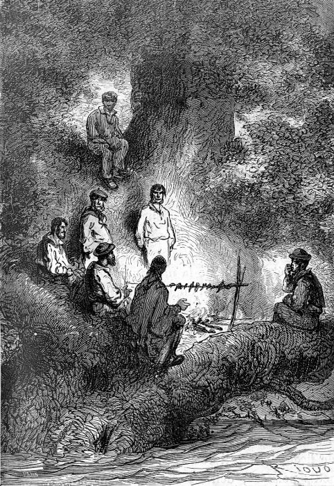 At evening they encamped at the foot of some trees that bore the marks of a recent fire. They formed tall chimneys, as it were, for the flames had hollowed them out internally throughout their entire length.—p. 353.