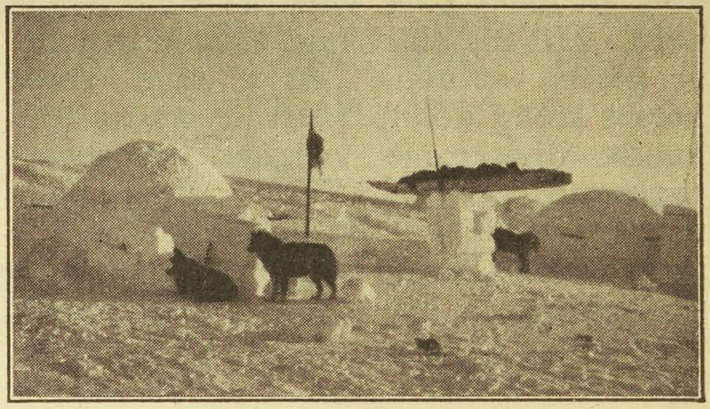 The frozen country they traversed is broken only by the remains of a once great forest, an ice-locked lagoon, horizons bounded by irridescent glaciers whose tips pierce the sky–and over all the sparkling arctic sunshine flooding the wide plains which stretch away to the Mystery of the World. In their long hike they met no human being except one roving band of Indians. But they saw immense herds of cariboo, many moose, and now and then a cinnamon or grizzly bear. And all the while, the thermometer ranged from 47 to 70 degrees below zero.