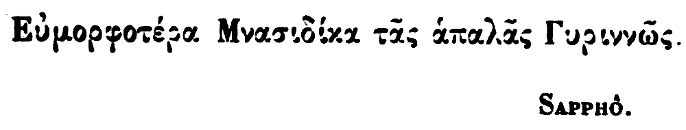 Alors, Sapphô était encore belle. Bilitis l'a connue, et elle nous parle d'elle sous le nom de Psappha quelle portait à Lesbos. Sans doute ce fut cette femme admirable qui apprit à la petite Pamphylienne l'art de chanter en phrases rhythmées, et de conserver à la postérité le souvenir des êtres chers. Malheureusement Bilitis donne peu de détails sur cette figure aujourd'hui si mal connue, et il y a lieu de le regretter, tant le moindre mot eût été précieux touchant la grande Inspiratrice. En revanche elle nous a laissé en une trentaine d'élégies l'histoire de son amitié avec une jeune fille de son âge qui se nommait Mnasidika, et qui vécut avec elle. Déjà nous connaissions le nom de cette jeune fille par un vers de Sapphô où sa beauté est exaltée; mais ce nom même était douteux, et Bergk était près de penser qu'elle s'appelait simplement Mnaïs. Les chansons qu'on lira plus loin prouvent que cette hypothèse doit être abandonnée. Mnasidika semble avoir été une petite fille très douce et très innocente, un de ces êtres charmants qui ont pour mission de se laisser adorer, d'autant plus chéris qu'ils font moins d'efforts pour mériter ce qu'on leur donne. Les amours sans motifs durent le plus longtemps: celui-ci dura dix années. On verra comment il se rompit par la faute de Bilitis, dont la jalousie excessive ne comprenait aucun éclectisme.