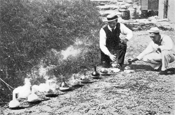 In the mining and other industries the fulminate is used in smaller quantities and it is generally mixed with potassium chlorate, the mixture being compressed in small copper cases and sold as blasting caps. They are fired by means of a piece of Bickford or running fuse, consisting of a woven cotton or hemp tube containing a core of gunpowder, which is inserted in the mouth of the copper cap and made fast within it by crimping. The capped fuse is then inserted in a dynamite cartridge so that the cap is firmly in contact with the dynamite, the mouth of the cartridge is fastened securely, and the charge inserted in the bore-hole in the rock and tamped. The protruding end of the fuse is lighted, and the fire travels at the rate of three feet per minute309 down the train of gunpowder to the fulminate, which then detonates and causes the detonation of the dynamite.