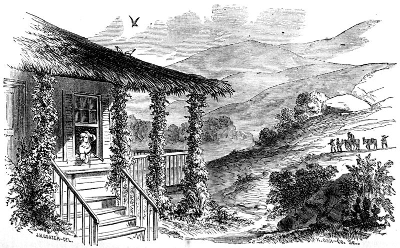 Before the gold excitement, that pretty ranche had been the abode of a quiet family, whose cattle were fed on the luxuriant herbage of the valley; but the reckless adventurers that crowded there soon drove the household into less turbulent quarters, and the dwelling changed its occupants many times. Thus its quiet walls soon became accustomed to scenes of strife and dissipation, which destroyed its respectable, home-like appearance entirely; and the place that had originally been a pleasing feature in the valley shared the general aspect of the neighborhood. Still, nature will assert her rights; and, amid the wild riot of the valley, vines grew luxuriantly as ever, flowers blossomed in the turf, and the water fall sounded loud and clear above the shouts of savage men, however turbulently they might be raised.