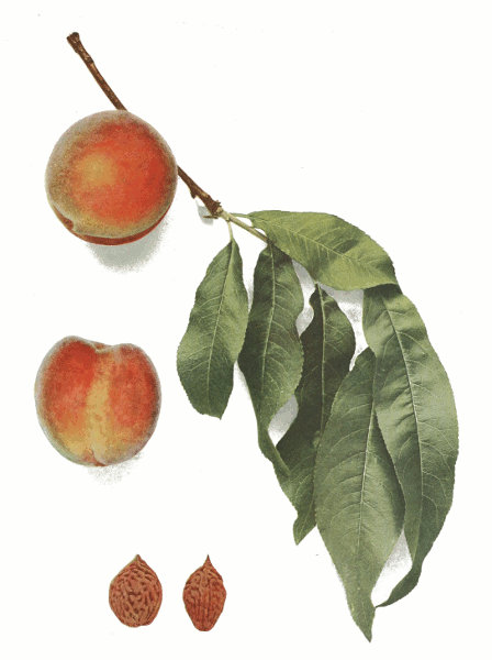 In all of these fruit-books it has been difficult to decide what varieties merit color-plates and full descriptions. Briefly, the choice of sorts to be illustrated and described in detail has been determined by the following considerations: (1) By the value of the variety for home or commercial orchards; (2) the probable value if the peach is a new sort on probation; (3) its desirability as a parent in breeding new peaches or to show combinations of varieties, to illustrate new characters, or to show the range in variation—in a word to enlighten the peach-breeder; (4) not a few varieties are described and illustrated to show the trend of peach-evolution—for their historical value; (5) to show relationships of varieties.