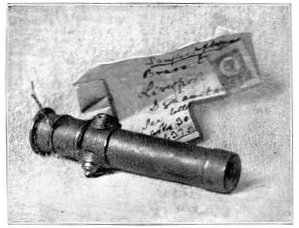 But the most interesting relic of 1882 is a little canister very much resembling a diminutive milk can (Fig. 9). It is supposed to contain dynamite, and has never been opened since its receipt at the House of Commons in that year, addressed to Mr. Forster, then Chief Secretary for Ireland.