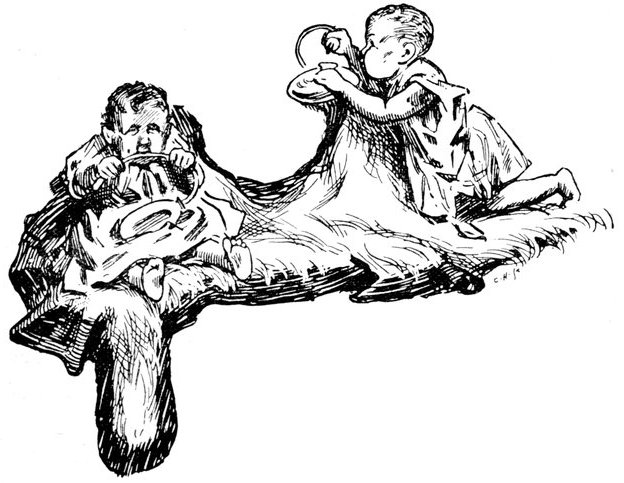 "Yes; and from a corner of the earth comes out the other boy who studied war; and he stands in front of the one-half of the earth where he lives, to prevent the Bully attacking it; and now there's a great battle—another—another—and another, and my baby is beaten back from one-half of that globe of yours, and the other baby stands in the middle of that half and crows; and my baby, the Bully, has to confine his attention to the half he has overrun and conquered, while a wild, delirious, long-pent-up shout of heartfelt relief comes up from the humans on the defended half. Where's that baby of yours—the doctor?"