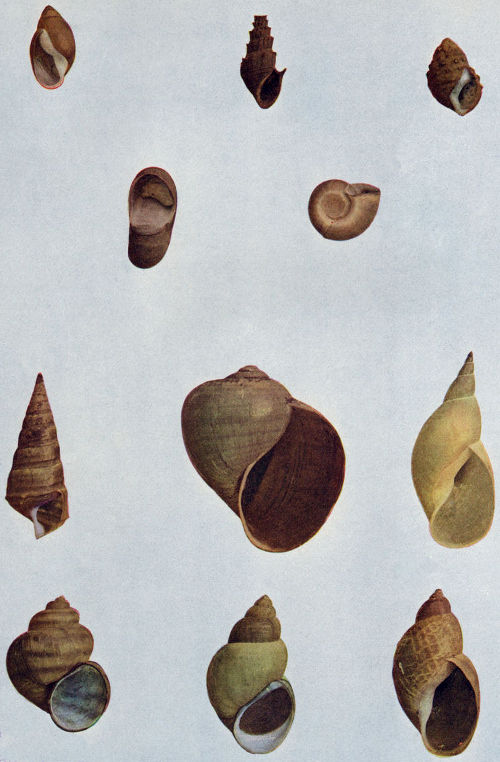 But there are many species of these smaller fresh-water snails that are pigmies, indeed, whose tiny shells do not exceed an eight of an inch in length and which require the aid of a microscope to adequately study their delicate organisms. These minute animals live on water plants and on any submerged object. They vary from long, pointed, steeple-like shells to those which are perfectly rounded like a miniature apple. In our own country these little creatures may be found in any of our ponds or streams, and the lively little animals are well worth a closer acquaintance. They are known scientifically under the difficult names of Paludinella, Amnicola, Somatogyrus, Fluminicola, with many others, and do not bear any specific English titles.