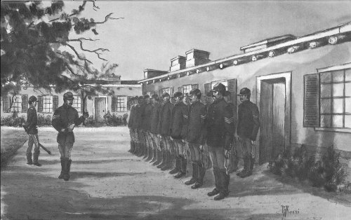 The post is getting to seem like home to most of us by now. Pretty fair place. The buildings are made of mud, or what people around here call adobe. The adobes are made of brown clay and baked in the sun, then stuck together with the same mud after they’re baked hard. The two barracks face the parade ground from the east and from the west. They are both about 119 feet long and 33 feet wide; the roofs are nearly flat, with a slight slope toward the parade. The inside of each barrack is divided into several rooms, including: company office, store room, two squad-rooms and a kitchen. The latter is used also for mess. The walls are the same adobe, white-washed. Each barrack was built to house one company. The squad rooms are heated by open fireplaces—looks like we’ll freeze come winter, except when we’re backed up to the fire burning our pants.