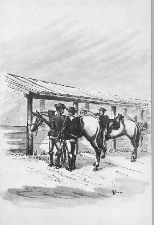 May 6, 1864. Bunch of the boys went over to Posthoff’s last evening for a last blow before leaving the post for the summer. The sutler’s store may have about all a soldier needs in the way of underwear, boots, saddle soap, and the rest, but it stocks no whiskey. Posthoff’s store, being off the reservation proper, takes care of this 10 shortage for us. Posthoff stocks about everything needed in these parts by the civilians too, of course. But last night we tried to drink old Posthoff out of liquor—and almost did. About every man in the 1st Cavalry was there, with pretty Mexican and Indian girls bringing in food and filling our cups. All day long a company of horse soldiers have been sorry they kept such late hours. The smell of dust and saddle leather has done a lot for our thirst, but little for our appetites. It’s days like this that make me wonder if the $17 a sergeant gets each month is worth it.