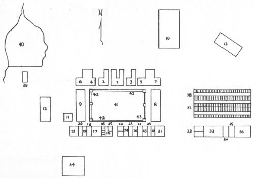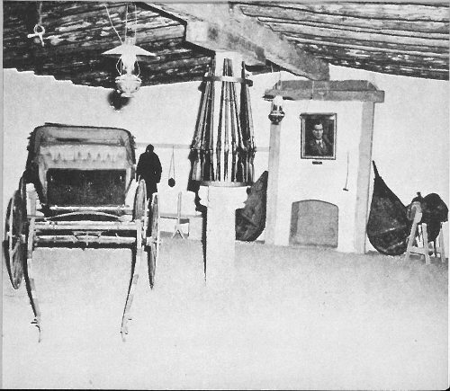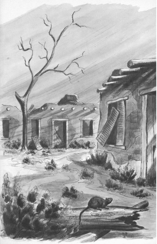 The stables are located some 120 paces due east of the east barrack and are strong smelling quarters, consisting of three long corrals built of the same old adobe. The corrals contain sheds for the common horses and enclosed stables for the officers’ mounts.
