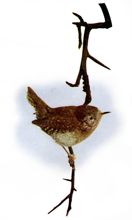 And Audubon beautifully expresses the song as it appealed to him: “The song of the Winter Wren excels that of any other bird of its size with which I am acquainted. It is truly musical, full of cadence, energetic and melodious; its very continuance is surprising, and dull indeed must be the ear that thrills not on hearing it. When emitted, as it often is, from the dark depths of the unwholesome swamps, it operates so powerfully on the mind that it by contrast inspires a feeling of wonder and delight, and on such occasions has impressed me with a sense of the goodness of the Almighty Creator, who has rendered every spot of earth in some way subservient to the welfare of His creatures.”