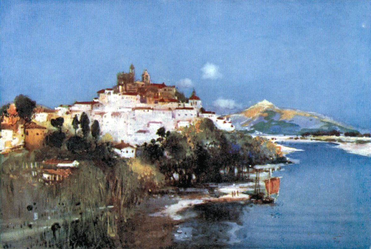 The country around Pontevedra is remarkably picturesque and fertile, and has long been famous for its grapes and oranges and citrons. In Borrow's day the town was surrounded by a wall of hewn stone, of which parts remain, although there is nothing left of the turrets which formerly stood for purposes of defence and observation. The river Lerez runs into Pontevedra Bay, and a few miles outside the town, forming an extensive enclosure, is an estate, with the Hotel Mendez Nuñez, where the Lerez waters are bottled for home and foreign use. In the summer time marine excursions are run from Pontevedra to the estate, the river being a pleasant and enjoyable mode of travel. At that season the stream is low and placid, but in time of storm and heavy rains the Lerez swells rapidly and becomes a roaring torrent. The Lerez rises in the Candan Sierra, and in those wild and lonely hills the wolf still roams, although he is seldom seen.