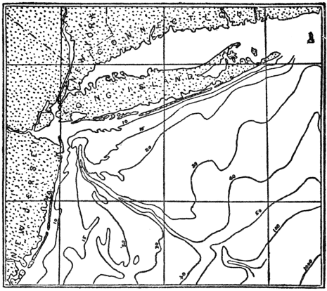 Drowned River Valley.—When a land surface sinks enough to permit tidewater to enter the lower ends of its valleys to form estuaries, a good example being the lower Hudson Valley.
