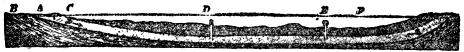 Unconformity.—A break in the regular succession of sedimentary rocks, indicated by the fact that one bed rests on the eroded surface of one or more beds which may have a distinctly different dip from the bed above. An unconformity may indicate that the beds below it have at some time been raised above the sea and have been eroded. In some places beds thousands of feet thick have been washed away before the land again became submerged and the first bed above the surface of unconformity was deposited. If beds of rock may be regarded as leaves in the volume of geologic history, an unconformity marks a gap in the record.