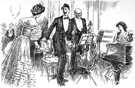 Violinist (one of trio of amateurs who have just obliged with rather lengthy performance). "Well, we've left off at last!" Hostess. "Thank you so much!"