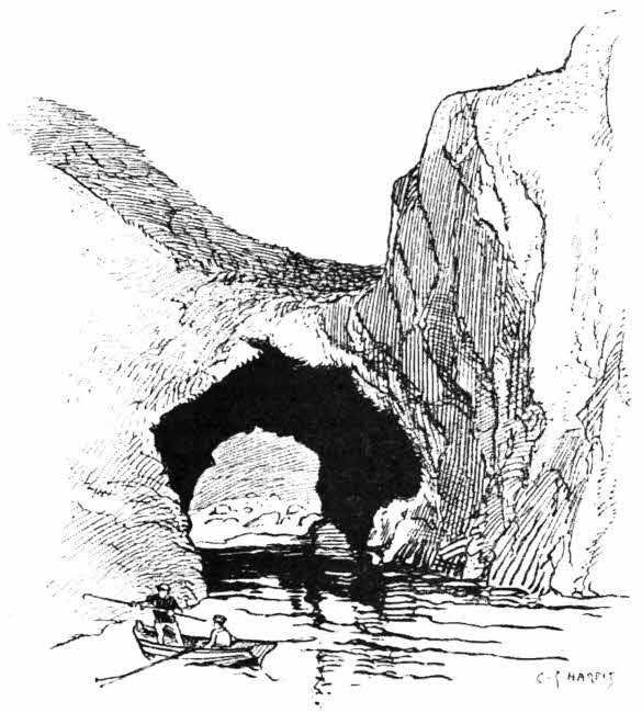 A lovely nook opens out beyond Pendower Cove, at Nanjizel, or Mill Bay, where there is a natural archway and a tall rifted cavern in the headland of Carn-les-Boel, known as the "Song of the Sea," perhaps the most entirely beautiful and romantic cave in Cornwall.
