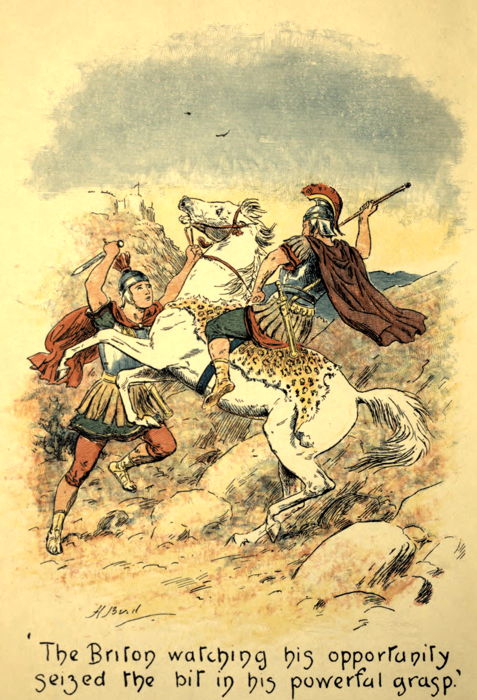 | “THE BRITON, WATCHING HIS OPPORTUNITY, SEIZED THE BIT IN HIS POWERFUL GRASP” | Coloured Frontispiece |